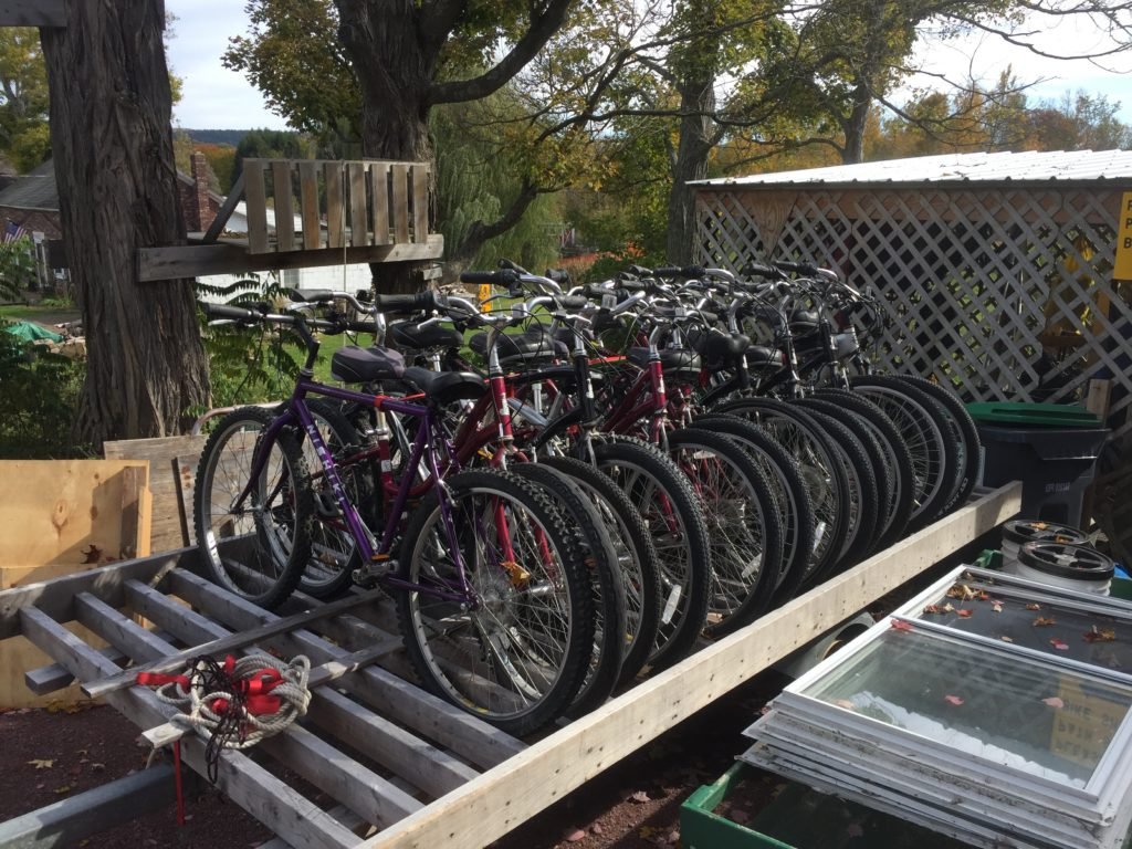 The barn is a barn in every sense of the word; an uninsulated building with daylight peeking under the walls and open beams above. The only thing un-barnlike would be the slate laid out on the dirt floor and of course the huge selection of bicycles hanging neatly about. I’m pretty sure there were more new bikes inside this barn than most of the shops had that I had visited over the previous month, but there was something else about this bike shop; outside, there were many more used bikes hanging up, leaning against the barn and scattered around the lawn.