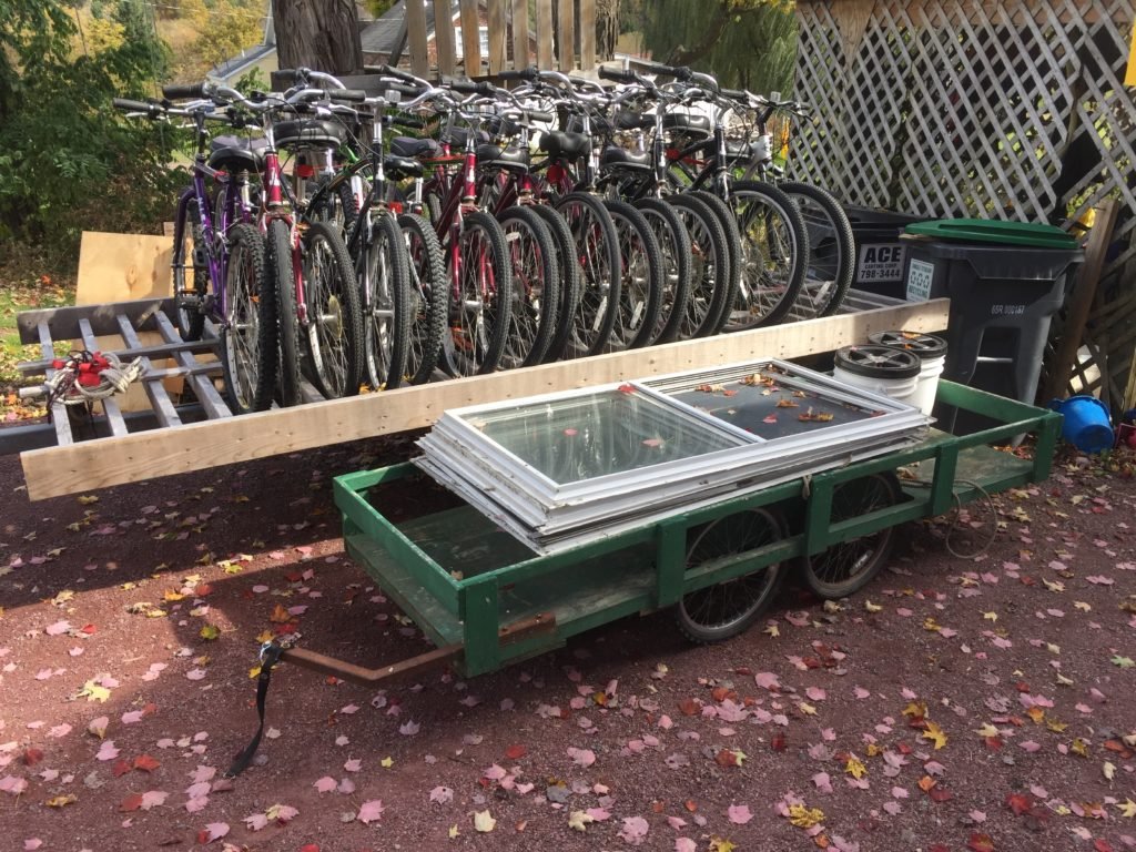 This time, I wasn’t riding by. This time it was my destination and I was hoping to get the parts I needed to get my trailer hooked up to the bike. I figured this would be the right place since I remember his wife pulling that trailer all those years ago. We pulled up to the house which till looked the same, but now there was a trailer out front full of bikes and of course, that big green bicycle trailer I remembered. A sign told visitors to take the narrow path around back.
