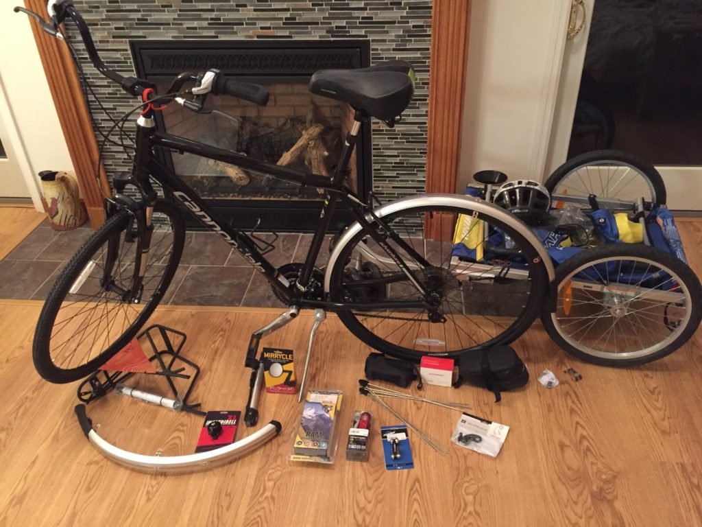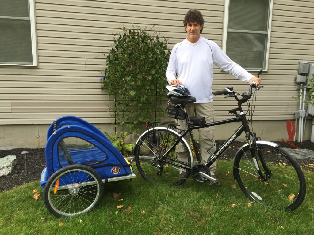 Tim returned and introduced himself to me. I explained that I had just bought this used bike and had already acquired some accessories elsewhere, but I had this trailer I wanted to pull and I told him how I’d now be living car free. Tim immediately began to assist me. First thing he did was to find me a holder for my Tire Pump as I had lost that part. He then told me it was no charge. As he explained where it would mount, he grabbed an allen wrench off his work bench and simply installed it as we spoke. Next up was the hitch. He found the part I could use with the current Schwinn set up and said I could have that too – no charge. He then showed me the Burley system and as he was explaining how that worked, he installed it on my trailer. I liked the Burley system better so I bought that. He then showed me a few different back racks that would work for me.