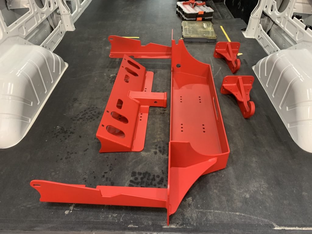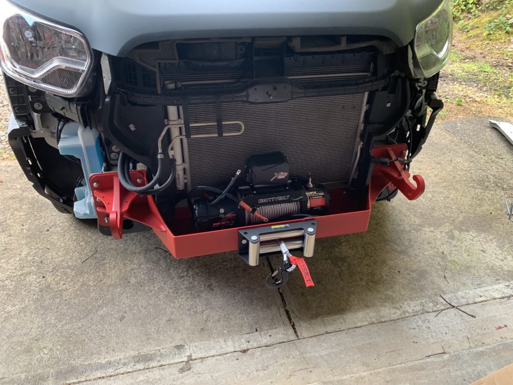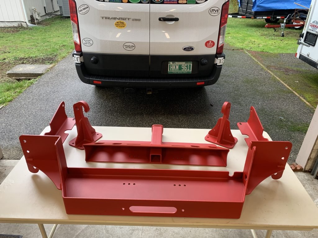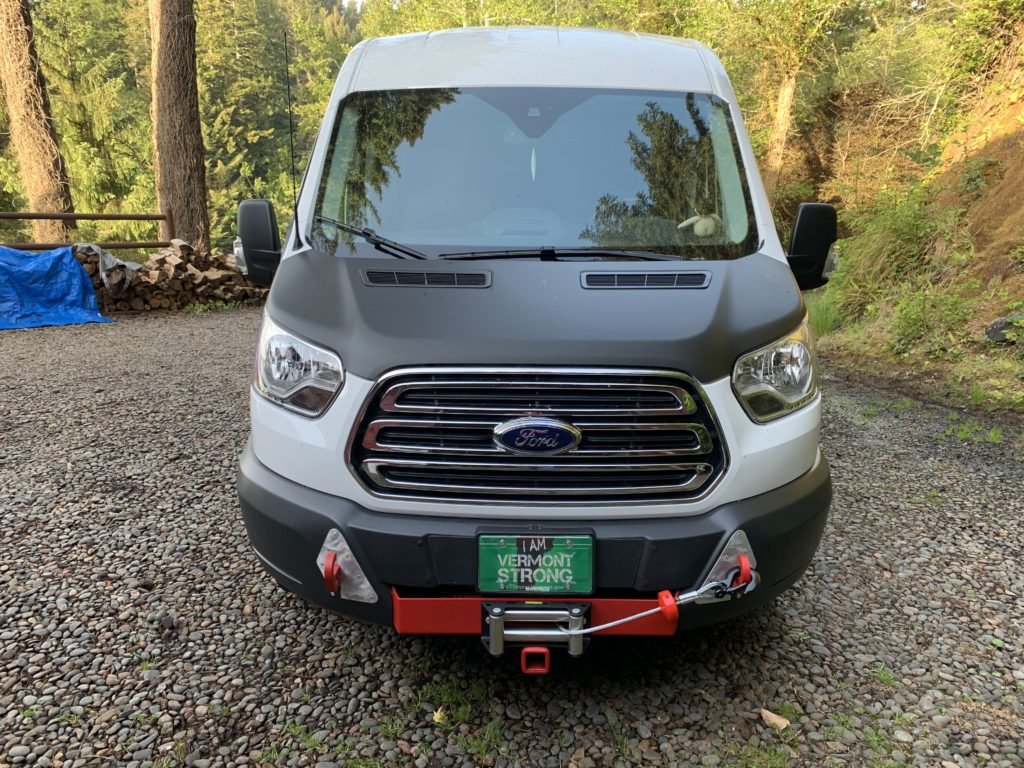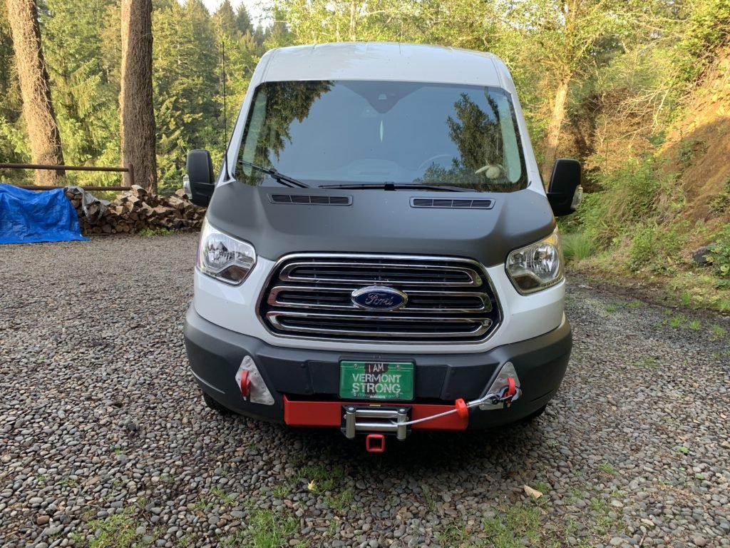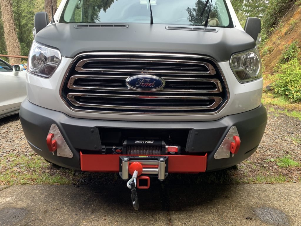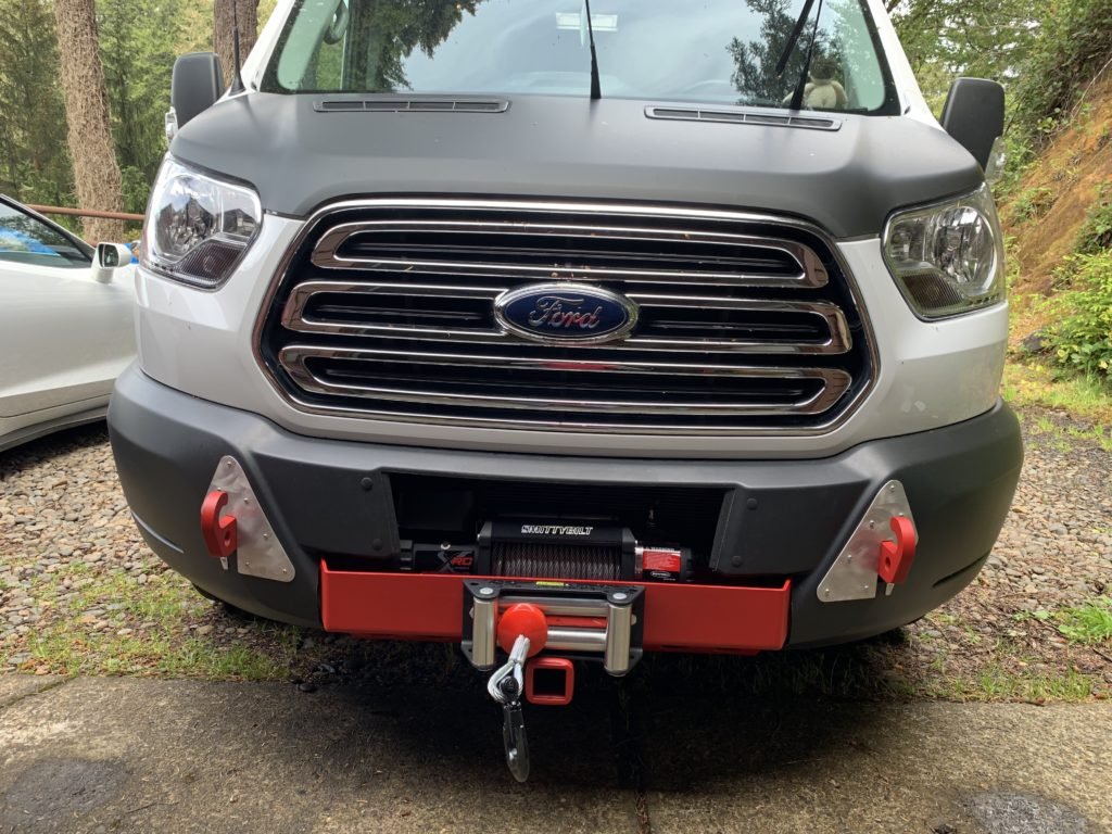 Within the first week that I began the Upfit, I had purchased a number of items that I was simply not sure when I’d get to them, but I wanted them ready to go when I did. Two of those items were the Lift Kit (yet to be installed) and the Winch Mount from Van Compass. I had elected to go with a winch over the 4×4 option as I wasn’t ready to drop $18k on a 4×4 conversion – just yet, but I wanted to be sure I could get myself out of trouble if I found myself stuck anywhere. There are two options for a winch on the Ford Transit. The Aluminess system replaced the entire front bumper – which looks nice, but it exposes the engine compartment, which I didn’t like. The other was a Winch mount from Van Compass that retained most of the front bumper. I liked how this looked – mostly.