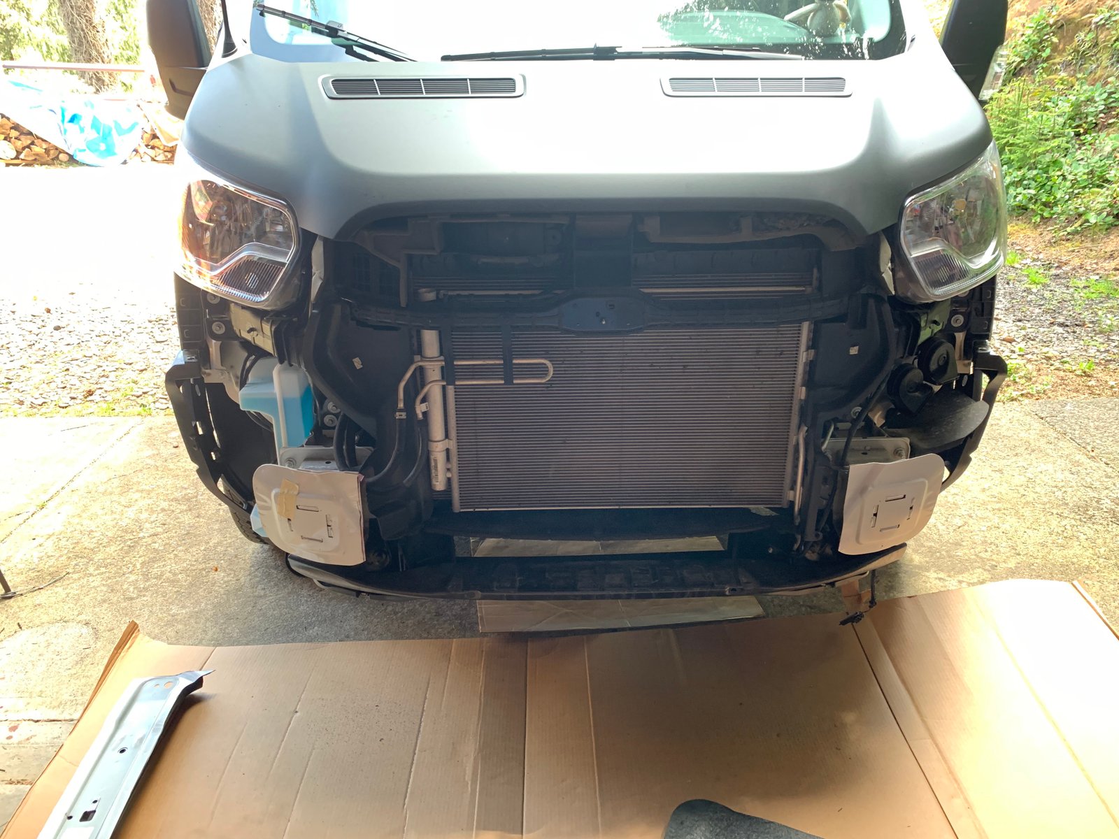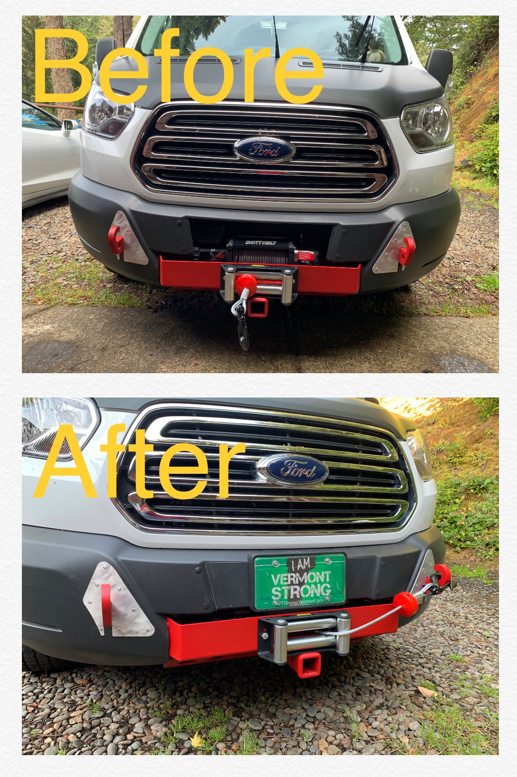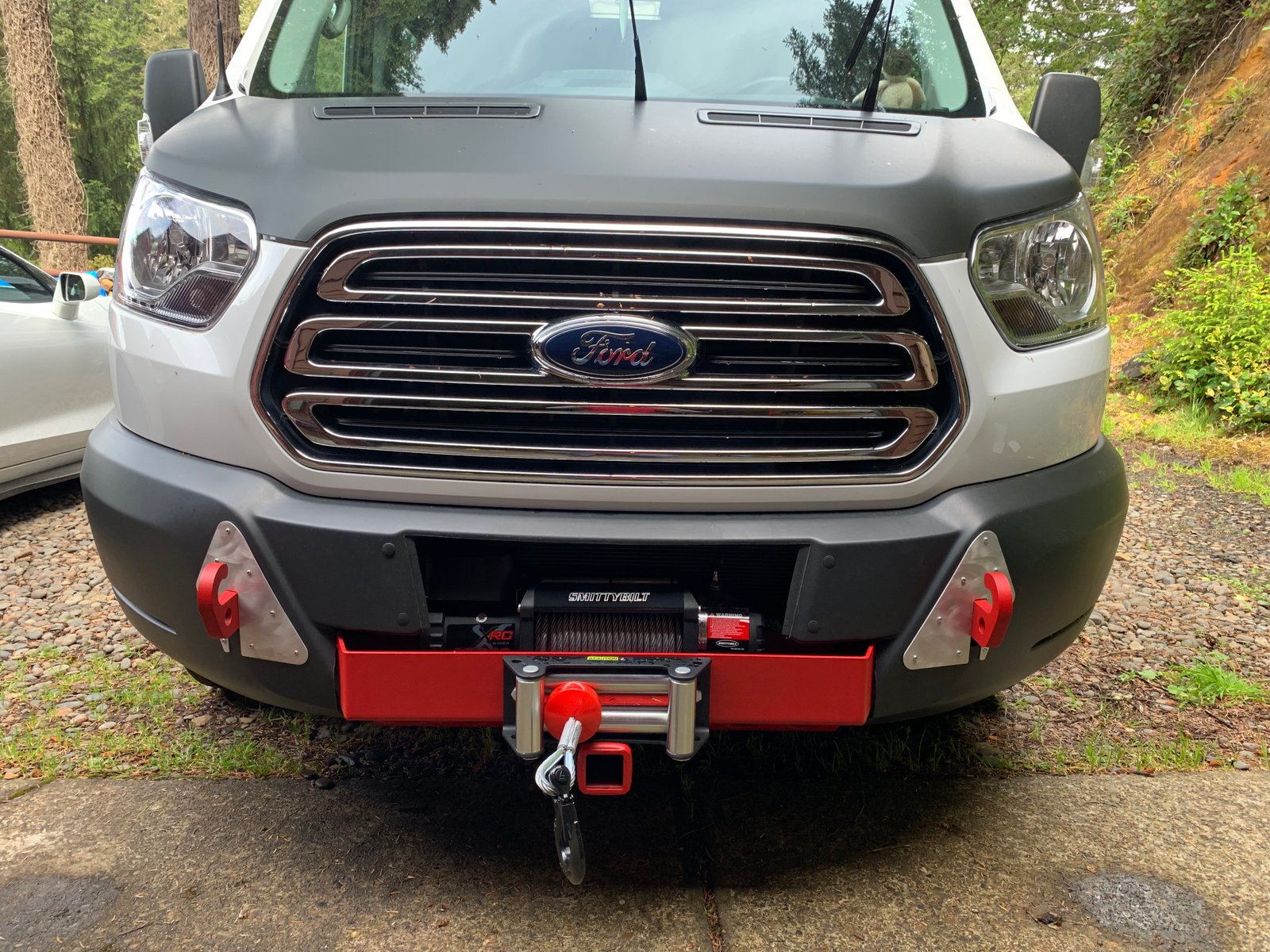 Within the first week that I began the Upfit, I had purchased a number of items that I was simply not sure when I’d get to them, but I wanted them ready to go when I did. Two of those items were the Lift Kit (yet to be installed) and the Winch Mount from Van Compass. I had elected to go with a winch over the 4×4 option as I wasn’t ready to drop $18k on a 4×4 conversion – just yet, but I wanted to be sure I could get myself out of trouble if I found myself stuck anywhere. There are two options for a winch on the Ford Transit. The Aluminess system replaced the entire front bumper – which looks nice, but it exposes the engine compartment, which I didn’t like. The other was a Winch mount from Van Compass that retained most of the front bumper. I liked how this looked – mostly.