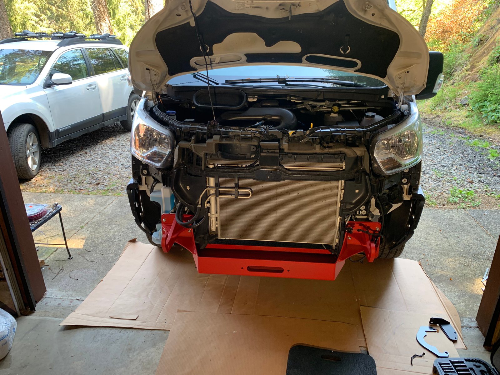 Once my winch arrived here in Oregon, I took to the cutting up of the front end to make way for the install. If you think cutting giant holes in your new vehicle is worrisome, try cutting out and up your bumper. The total install time was probably about 6 hours, but I didn’t spend all day on it. Instead, I did it over a couple of days. When it came time to cutting the large opening in the bumper, I wanted to be extra careful as I was already planning on doing something with it after. i didn’t like how exposed the radiator was and had planned on making some kind of cover with it.