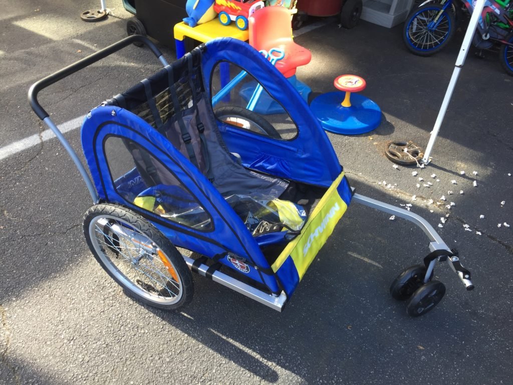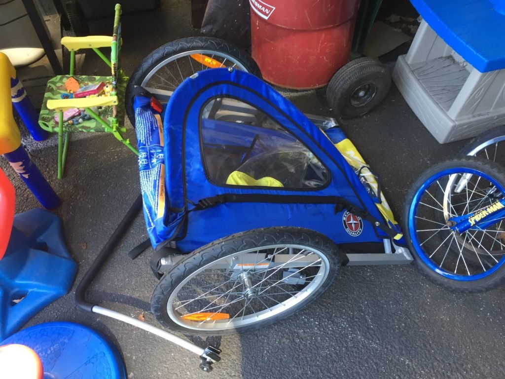 discovered someone has donated a Schwinn Bicycle trailer for pulling children behind a bicycle. I saw this and knew it was perfect for what I needed. I could easily convert this into a utility trailer for my future bike, but I didn’t have money to buy it, what I did have was time my time. I gave Donna a ring and worked out a barter agreement with her. I now had a trailer for a bicycle I didn’t have yet.